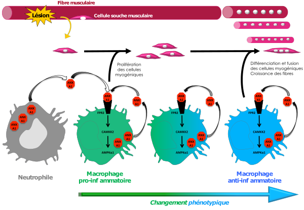 Les expériences réalisées à l’Institut NeuroMyogène sur des souris dépourvues totalement ou en partie d'AnxA1 présentaient un défaut de ce processus de régénération musculaire. En collaboration avec l’Institut William Harvey à Londres, des expériences in vitro sur des macrophages humains dépourvus de la protéine AMPK ont permis de mettre en évidence l’importance de la voie de signalisation AnxA1/FPR2/AMPK dans le processus de différenciation des macrophages en un phénotype permettant la réparation tissulaire.