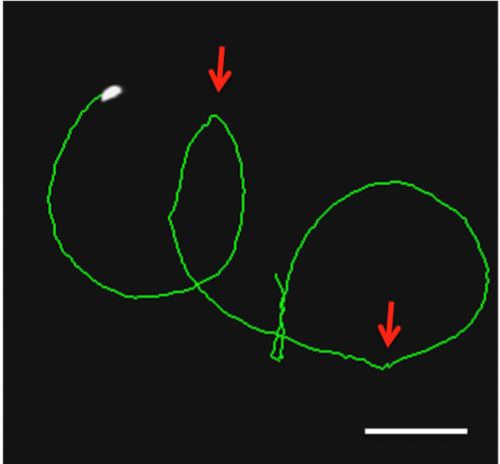 Trajectoire circulaire (vert) d'une bactérie E. Coli (blanc) au voisinage d'une surface (vidéomicroscopie en champ sombre). La bactérie accomplie des réorientations (flèches rouges) sans toutefois quitter la surface. ?chelle : 10 ?m.