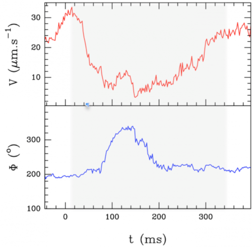 Courbe de la vitesse (en haut, en rouge) et de l'orientation (en bas, en bleu) en fonction du temps. Un évènement de réorientation (surlignage gris) s'accompagne d'une chute de vitesse qui précède la réorientation angulaire (panel de droite)
