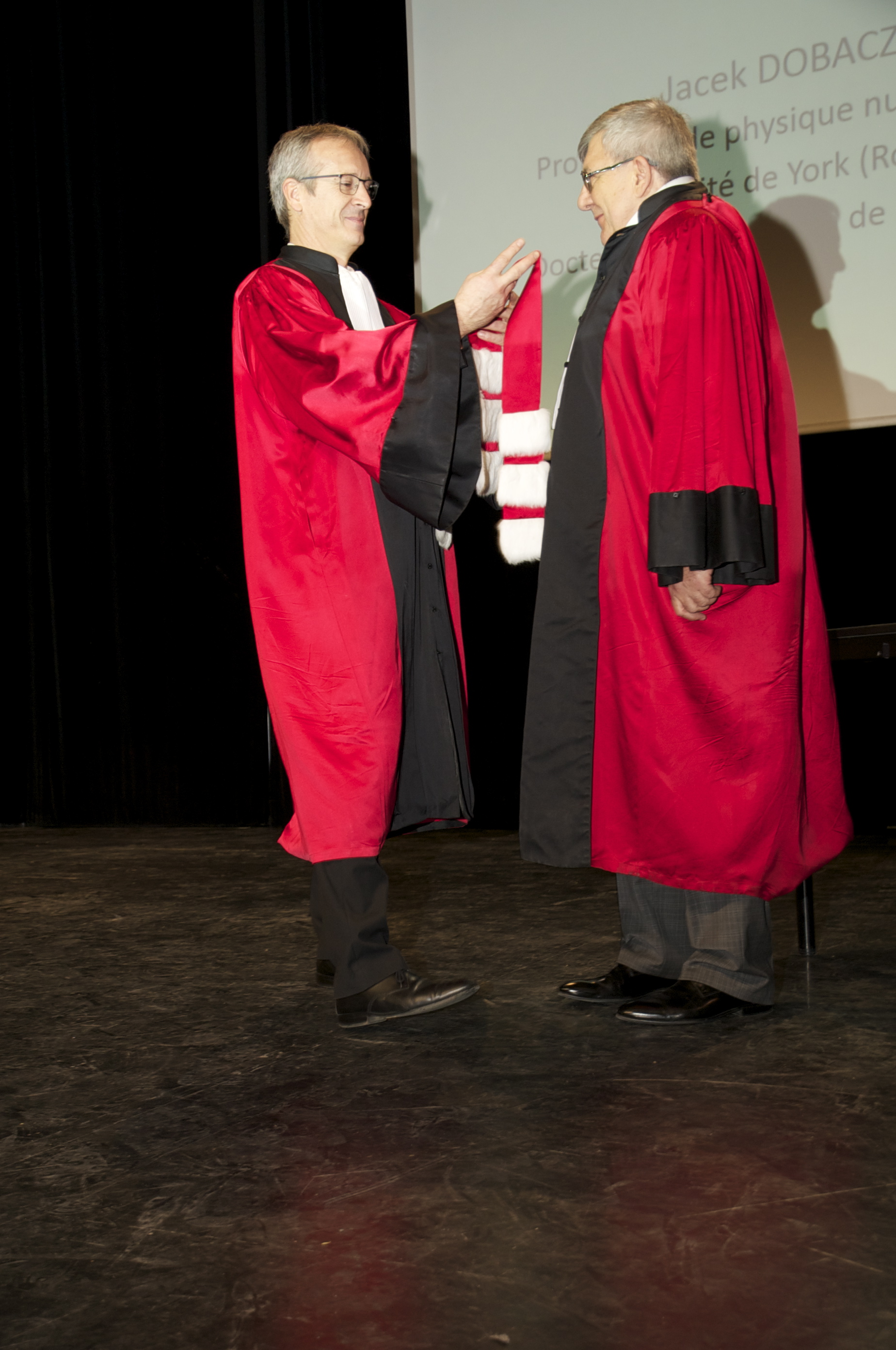 Jacek DOBACZEWSKI en présence de son Parrain Karim Bennaceur, Ma?tre de conférences Physique Théorique à l'IPNL, du Président Frédéric Fleury et du Vice-président du conseil scientifique Fabrice Vallee.