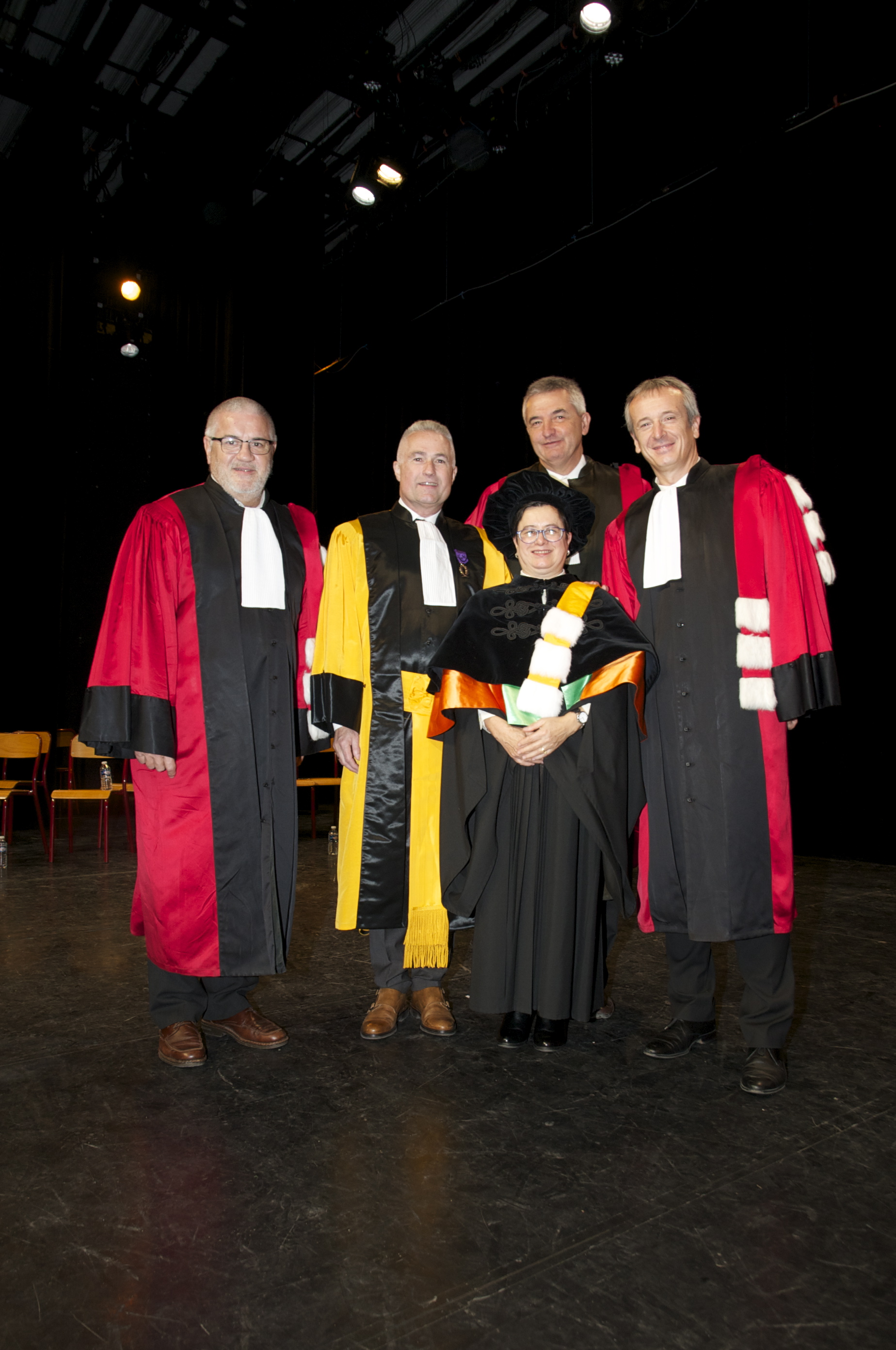 Gra?a de Carvalho en présence de son parrain Alain Mougniotte, Directeur de l’ESPE de Lyon, du Président Frédéric Fleury, du Vice-président du conseil scientifique Fabrice Vallee et de Dominique Berger, Directeur adjoint recherche de l'ESPE de Lyon.