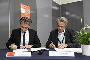 Philippe Chevalier, Vice-Président Commission de la Formation et Vie Universitaire du Conseil Académique de l'Université Claude Bernard Lyon 1 et Eric Guillaumot, Délégué Régional APEC signent la convention de partenariat. ? Eric Le Roux – Direction de la Communication Lyon 1