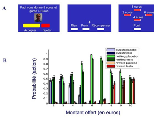 Bien qu’une croyance populaire laisse croire que la testostérone augmente les comportements agressifs et antisociaux chez l’homme, une théorie contemporaine propose que la testostérone aide à maintenir ou à améliorer son statut social. Deux prédictions centrales et encore non-testées de cette théorie sont que la testostérone stimule non seulement les réactions agressives aux provocations, mais qu’elle promeut également les comportements non-agressifs, comme la générosité envers d’autres, quand ces derniers sont appropriés pour augmenter son statut social.Cette étude a testé ces deux hypothèses chez des jeunes hommes en leur injectant de la testostérone ou un placebo en double aveugle. Les participants jouaient à une version modifiée du jeu de l’ultimatum, dans laquelle après avoir accepté ou rejeté une offre de partage d’argent de différents proposants, ils avaient l’opportunité de punir ou de récompenser les proposants.