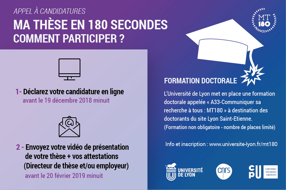 Retrouvez les prestations de nos doctorants et doctorantes ainsi que les résultats de l'édition 2018 de MT180. Et, si vous êtes doctorante ou doctorant, inscrivez-vous à la prochaine édition avant le 19 décembre 2018.