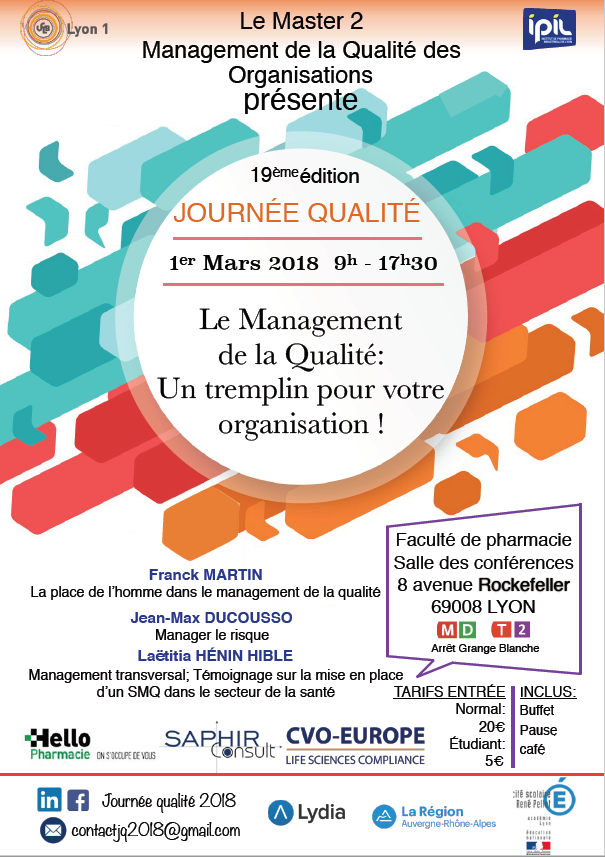 Cette journ¨¦e est organis¨¦e par l'association Qualitologie, g¨¦r¨¦e par les ¨¦tudiants du master 2 Management de la Qualit¨¦ des Organisations. Elle aura lieu ¨¤ la Facult¨¦ de Pharmacie de Lyon dans la salle des conf¨¦rences H.Hermann, de 9h00 ¨¤ 17h30.