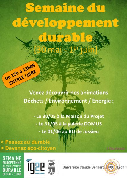 Les stands présentés porteront sur des thèmes du Développement Durable (comme les déchets, l'énergie, etc...) et seront animés par des étudiants de l'Ig2e du mardi 30 mai au jeudi 1er juin.
