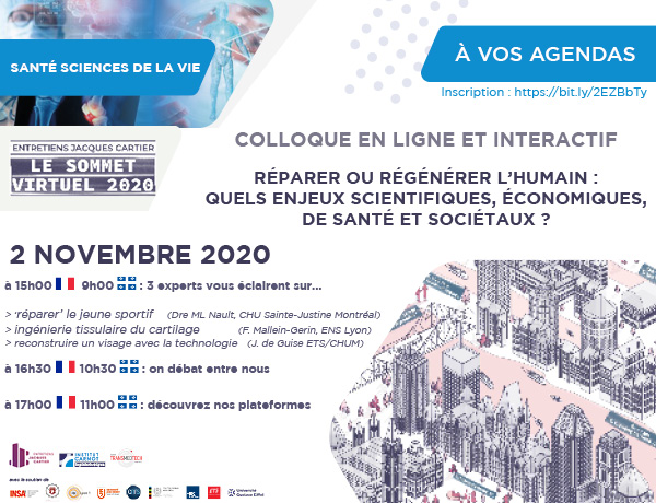 Le prochain colloque interactif "Réparer ou régénérer l’humain : quels enjeux scientifiques, économiques, de santé et sociétaux ?" se tiendra le lundi 2 Novembre 2020 à 15 h (heure fran?aise) dans le cadre des Entretiens Jacques Cartier 2020.