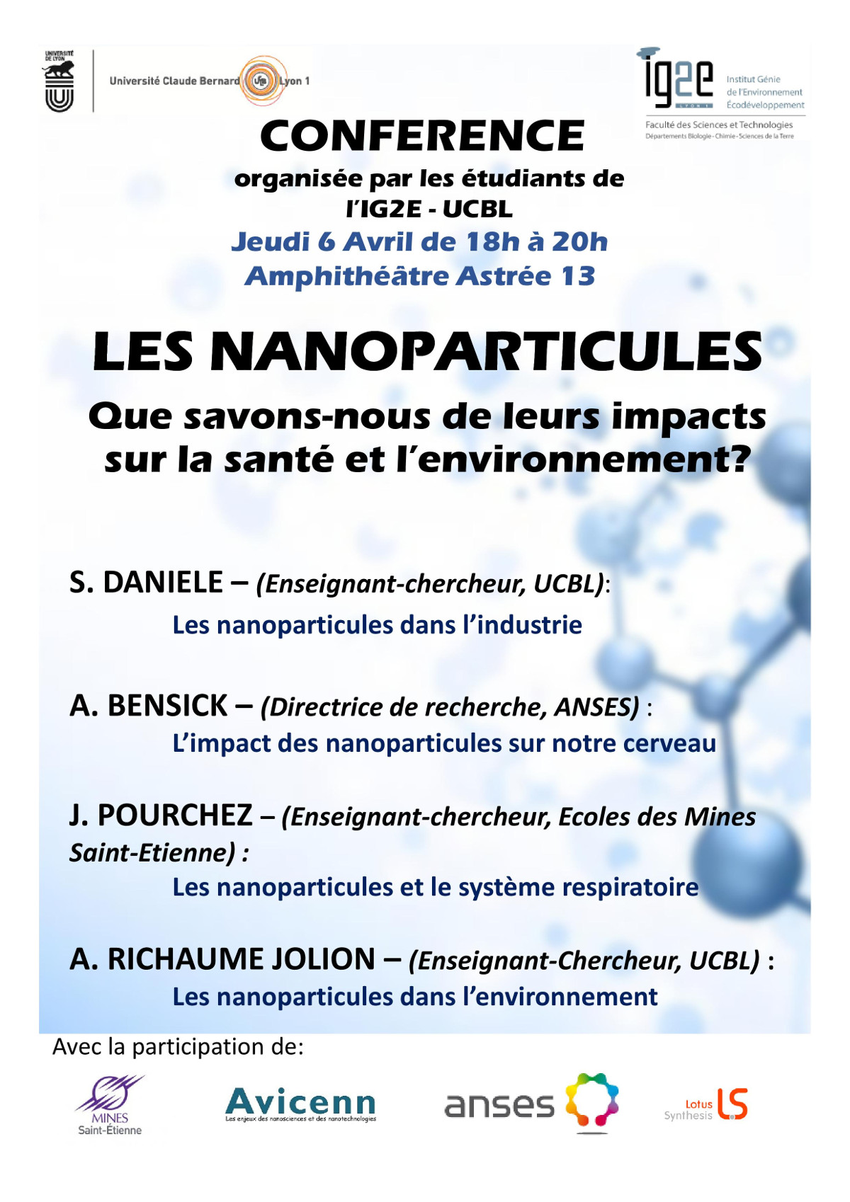 Le jeudi 6 avril 2017, de 18h à 20h dans l’amphithé?tre Astrée, aura lieu la conférence : "Les nanoparticules : que savons-nous de leurs impacts sur la santé et l’environnement ?" organisée par les étudiants de l’ig2e en partenariat avec AVICENN.