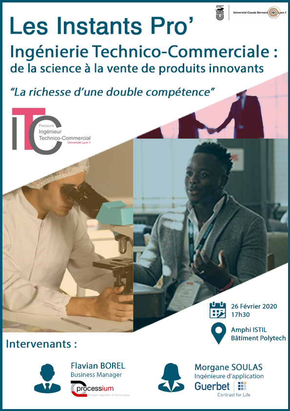 La promotion du Master ITC ( Ingénierie Technico -Commerciale ) organise une conférence sur la thématique " De la science à la vente de produits innovants" mettant en avant la richesse de la double compétence....venez nombreux !