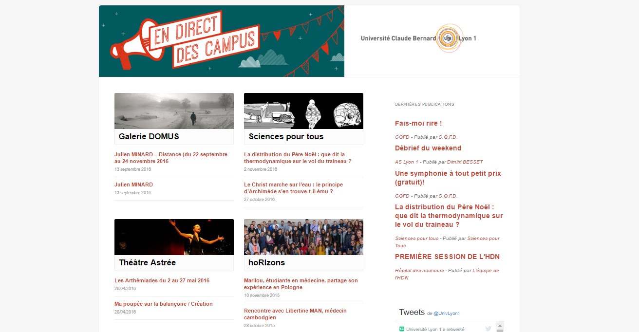 Campus.univ-lyon1.fr est une plateforme utilisant WordPress et regroupant de nombreux sites : événementiels, associatifs étudiants, services de l'université, communication scientifique...