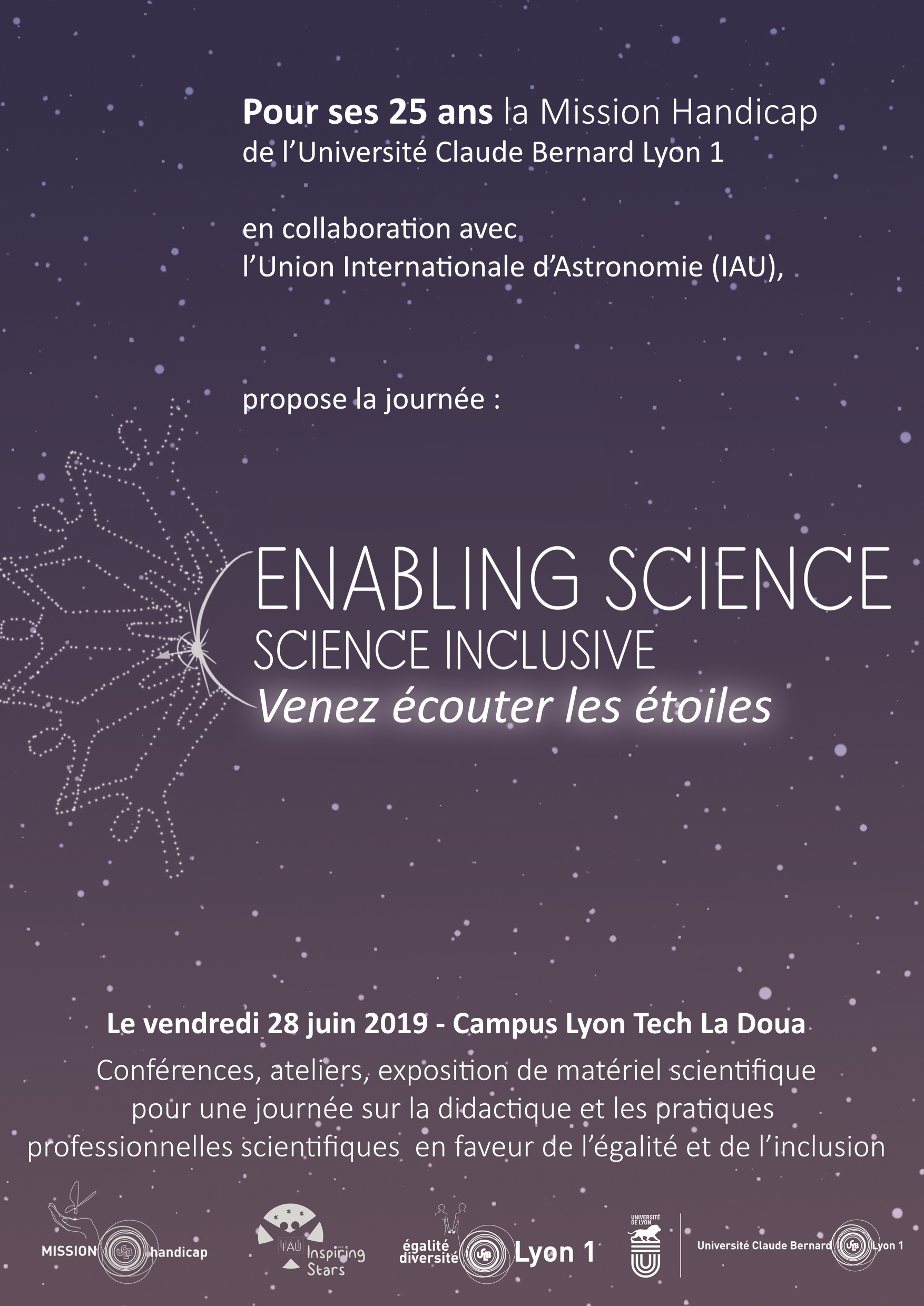 Conference, workshops, exhibit ... come join the study day on June 28, 2019 organised by the Mission Handicap of University Claude Bernard Lyon 1, in collaboration with the Intenational Astronomical Union (IAU)