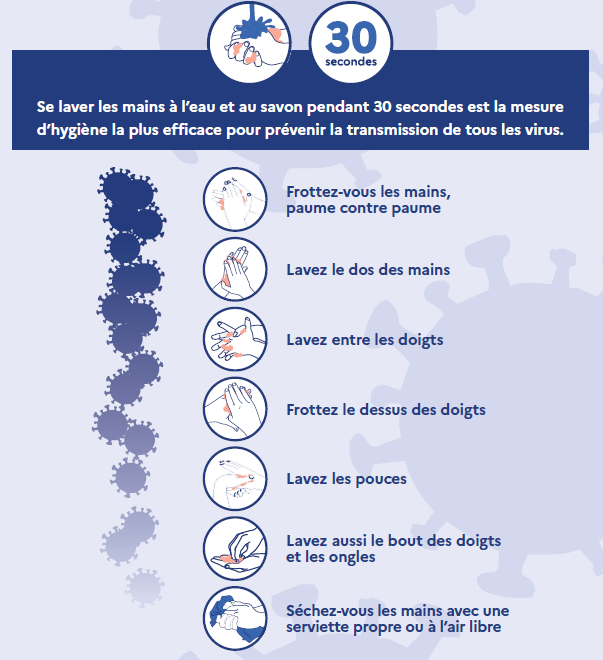 Il est rappelé que l’hygiène des mains est une mesure essentielle pour lutter contre la transmission croisée des agents pathogènes entre les personnes. En parallèle, un approvisionnement régulier en savon est effectué au niveau des sanitaires. Des produits désinfectants (points de distribution de gel hydro-alcoolique) sont mis à disposition des agents aux entrées / sorties des b?timents. Il est recommandé :