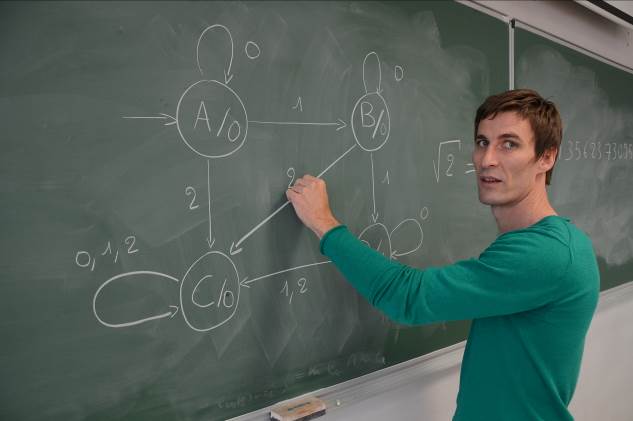 Au croisement des mathématiques et de l’informatique prennent place les automates. Expliqués grossièrement, il s’agit de processus permettant d’effectuer des calculs simples. En somme, un automate est fait d’états successifs et selon ce qu’on lui fournit comme donnée, il passe ou pas, d’un état à un autre. Il ne dispose pas de mémoire : seul son état au temps t nous renseigne partiellement sur les données qu’il a traitées. Pour Boris Adamczewski , ? On peut penser un automate fini comme un ordinateur appauvri à l’extrême ?. Mais ce lauréat ERC n’est pas informaticien : il manipule ses outils de manière théorique avec le regard d’un mathématicien.