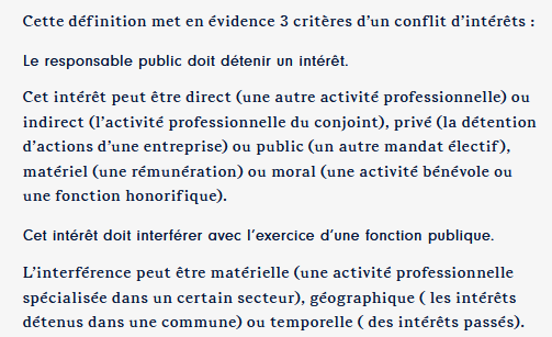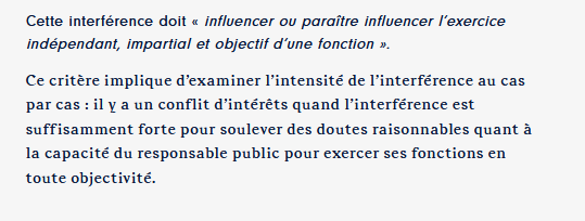 Attention : un conflit d’intérêts désigne toute situation d’interférence entre un intérêt public et des intérêts publics ou privés, de nature à influencer ou para?tre influencer l’exercice indépendant, impartial et objectif de ses fonctions (articles L. 121-4 et L. 121-5, et article L. 122-1 du CGFP).